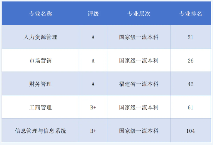 在高等教育专业评价机构软科发布的“2025软科中国大学专业排名”中,学院的市场营销、人力资源管理两个国家一流本科专业、财务管理一个福建省一流本科专业获评A等,工商管理及信息管理与信息系统获评B+。