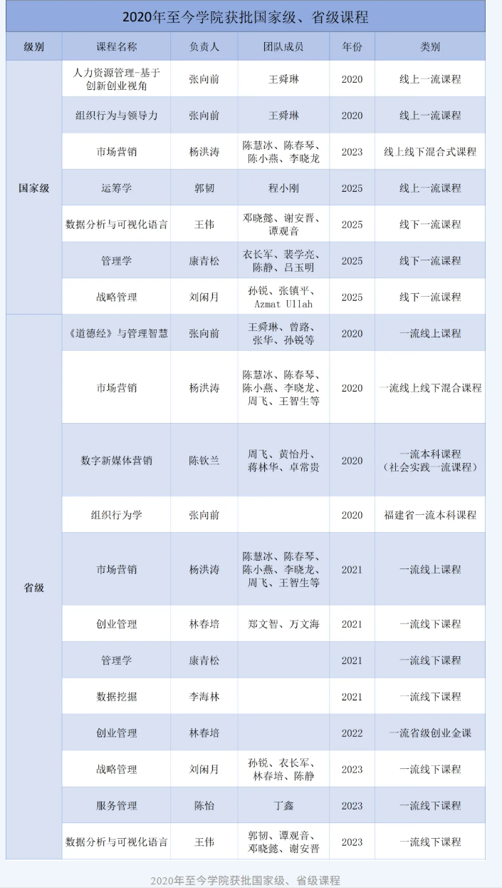 依托学科优势与团队力量,学院在一流课程与教材建设方面持续发力,形成了覆盖国家级、省级多个层次的高质量教学资源集群。2020年以来学院已建成19门国家级与省级一流本科课程,涵盖线上、线下、混合式等多种类型,其中《市场营销》《数据分析与可视化语言》等7门课程入选国家一流课程,充分体现出学院在课程设计、教学创新等方面的综合实力。