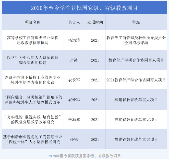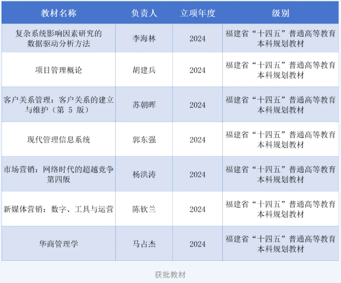 同时,学院于2024年获批7部福建省“十四五”普通高等教育本科规划教材,包括《华商管理》《市场营销》《现代管理信息系统》等,构建了与数字时代和新商科创新相适应的侨校教材体系。这些优质课程与教材的持续涌现,有力夯实了学院科研赋能教学、提升了人才培养内容供给的基础支撑。