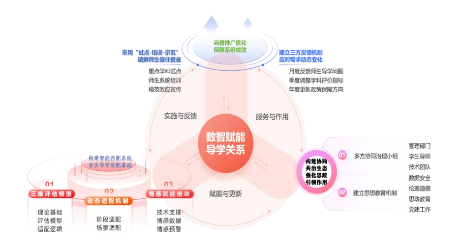 该项目立足破解传统研究生导学关系匹配单一、忽视人格特质等现实困境,创新性地将数智化技术与思想政治教育深度融合。项目构建了“以人为本、闭环迭代、协同共治”的工作体系,研发出涵盖基础人格、行为风格、学术特质的三维评估模型,实现师生人格与学术的双维精准匹配。同时设计动态适配机制,分阶段响应公司产品全周期需求,搭建情感赋能模块,通过语义分析与情感计算技术,及时感知师生沟通中的潜在问题,强化人文关怀渗透。